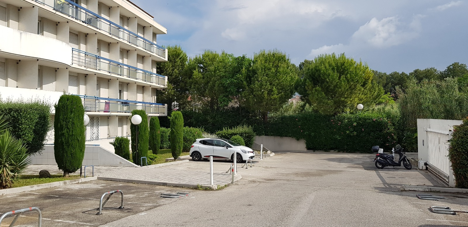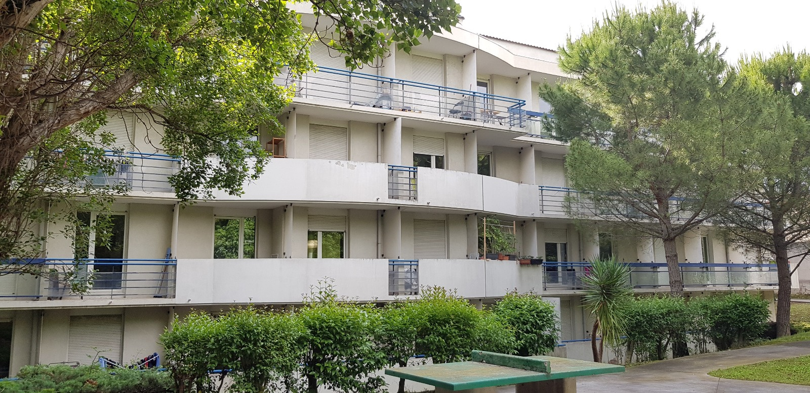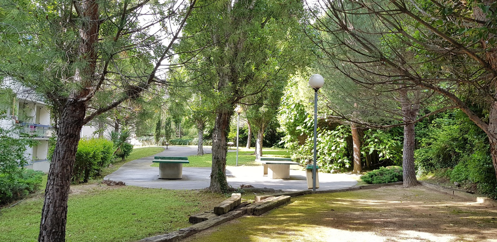Parc dans la résidence avec tables de ping-pong et boulodrome dans les pins.